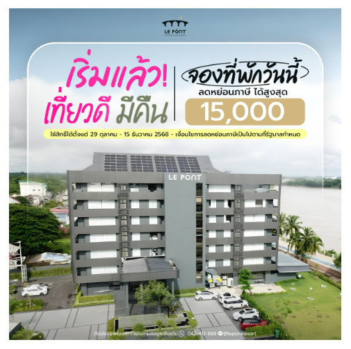 Book your stay at Le Pont Riverfront Resort Nongkhai, a riverside hotel by the Mekong River in the heart of Nong Khai city. Enjoy a relaxing getaway and receive tax deductions up to 15,000 THB when booking directly with us.Discover the perfect riverside escape — comfortable rooms, scenic views, and special privileges for Thai travelers joining the เที่ยวดีมีคืน campaign.